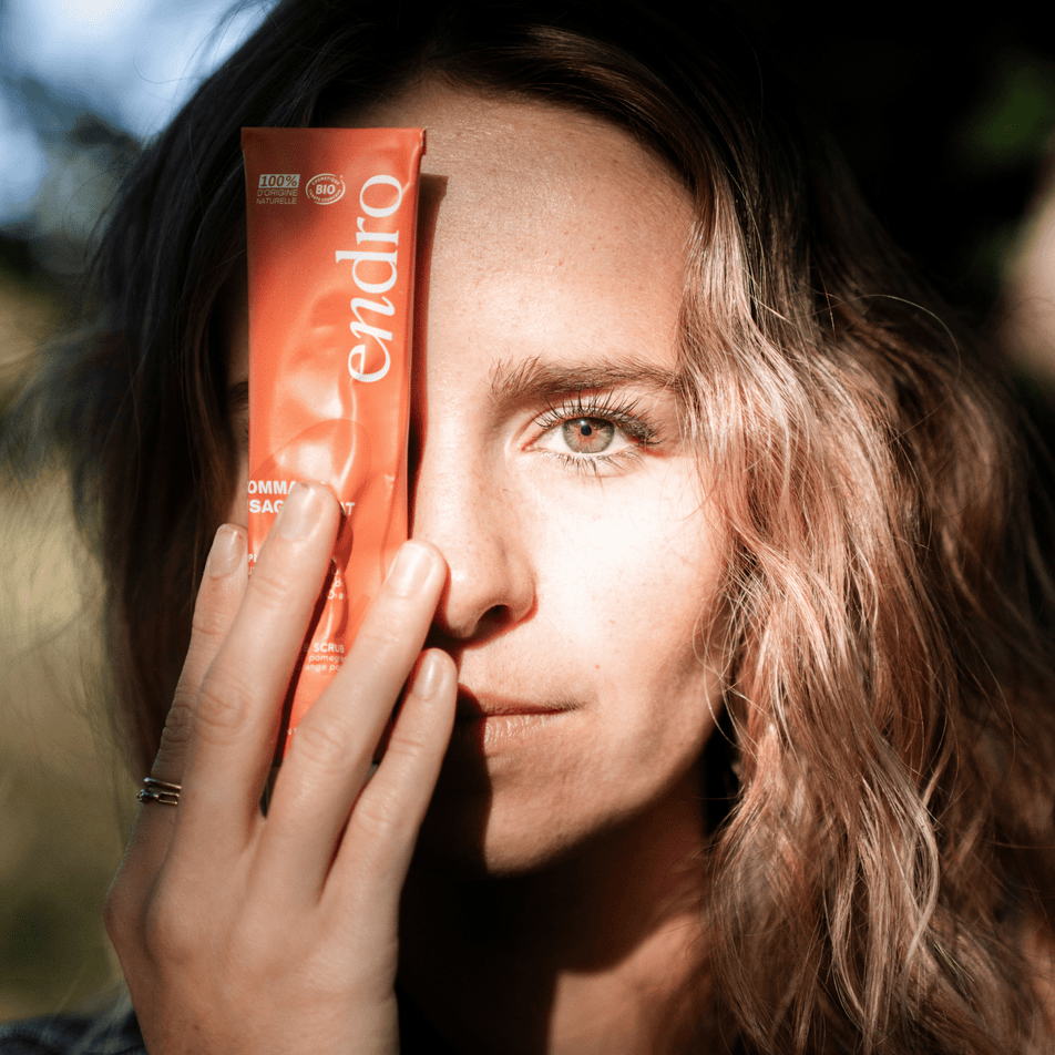 Endro utilise uniquement des exfoliants d’origine naturelle, issus de poudre de noyaux de pêche et d’oranges upcyclées, 100 % biodégradables et respectueux de l’environnement.