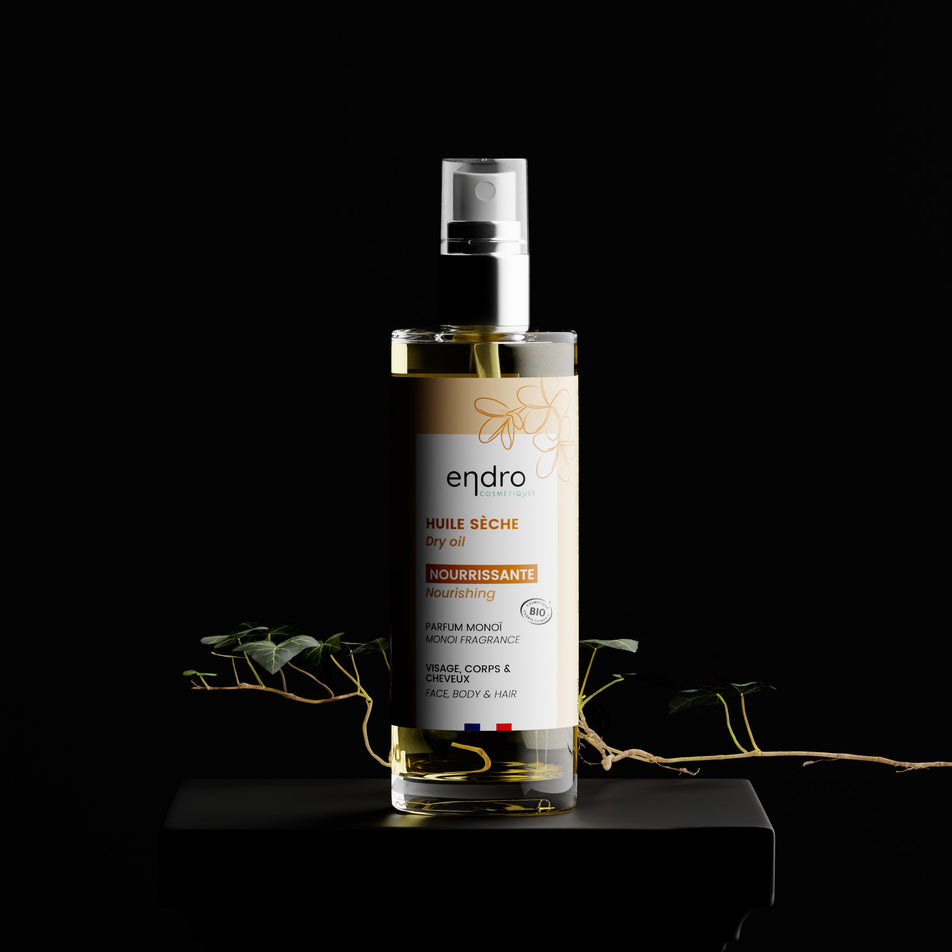 - L'huile sèche est multi-usage : très polyvalente, vous pouvez l'utiliser sur les cheveux, le visage mais aussi le corps. Elle va vous permettre de nourrir votre peau et vos cheveux.